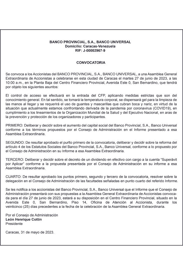 Se convoca a los Accionistas del BANCO PROVINCIAL, S.A., BANCO UNIVERSAL, a una Asamblea General Extraordinaria de Accionistas a celebrarse en esta ciudad de Caracas el martes 27 de junio de 2023, a las 10:00 a.m., en la Planta Baja del Centro Financiero Provincial, Avenida Este 0, San Bernardino, que tendrá por objeto los siguientes asuntos: