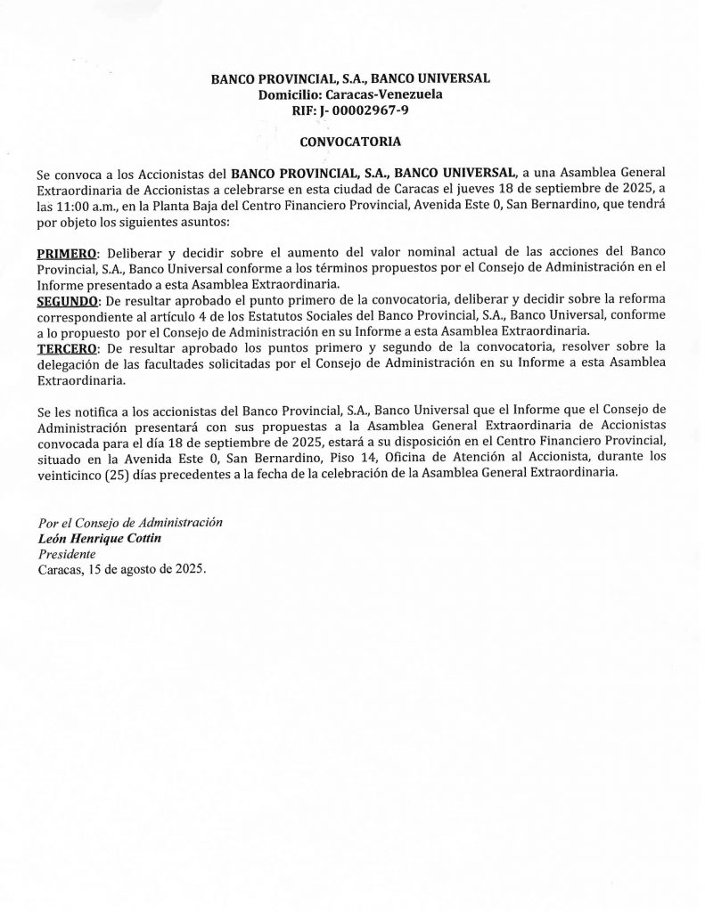 Se convoca a los Accionistas del BANCO PROVINCIAL, S.A., BANCO UNIVERSAL, a una Asamblea General Extraordinaria de Accionistas a celebrarse en esta ciudad de Caracas el jueves 18 de septiembre de 2025, a las 11:00 a.m., en la Planta Baja del Centro Financiero Provincial, Avenida Este 0, San Bernardino, que tendrá por objeto los siguientes asuntos: