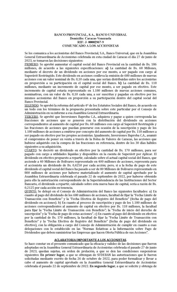 En la Asamblea General Extraordinaria de Accionistas del BANCO PROVINCIAL, S.A., Banco Universal, celebrada en esta ciudad de Caracas el día 27 de junio de 2023, previa convocatoria de conformidad con la ley, y conforme en un todo con las propuestas presentadas por el consejo de Administración en su Informe a esa Asamblea Extraordinaria, se adoptaron las siguientes decisiones;