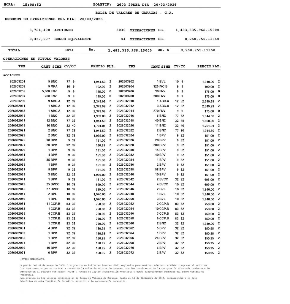 BOLETÍN DE OPERACIONES CORRESPONDIENTE “20/03/2026”