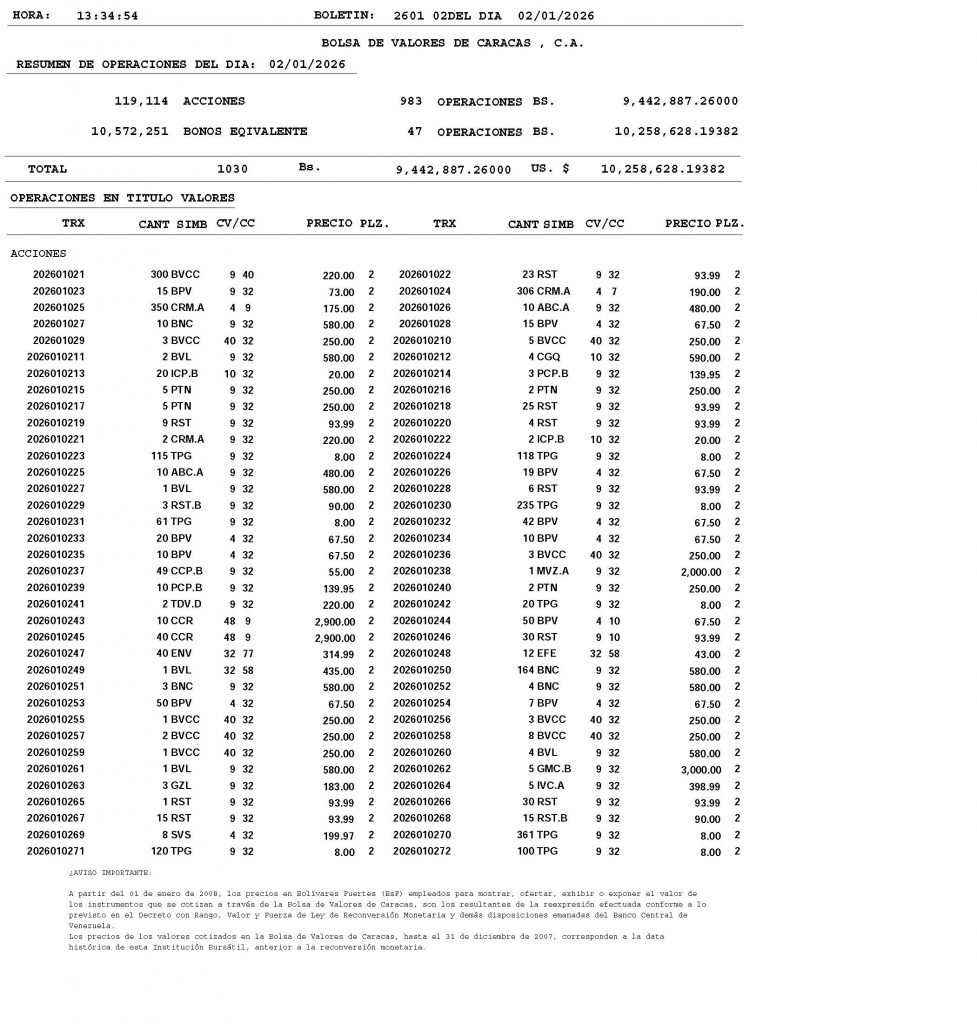 BOLETÍN DE OPERACIONES CORRESPONDIENTE AL “02/01/2026″