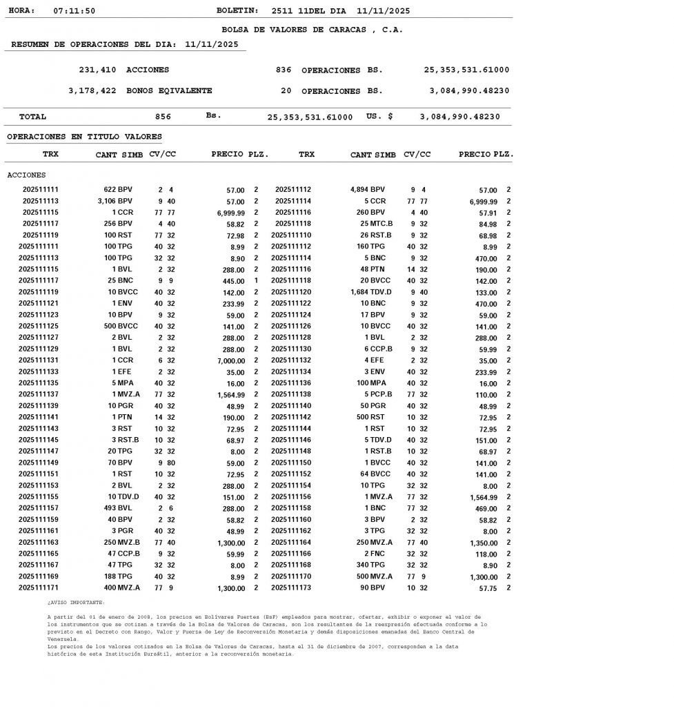 BOLETÍN DE OPERACIONES CORRESPONDIENTE AL “11/11/2025″