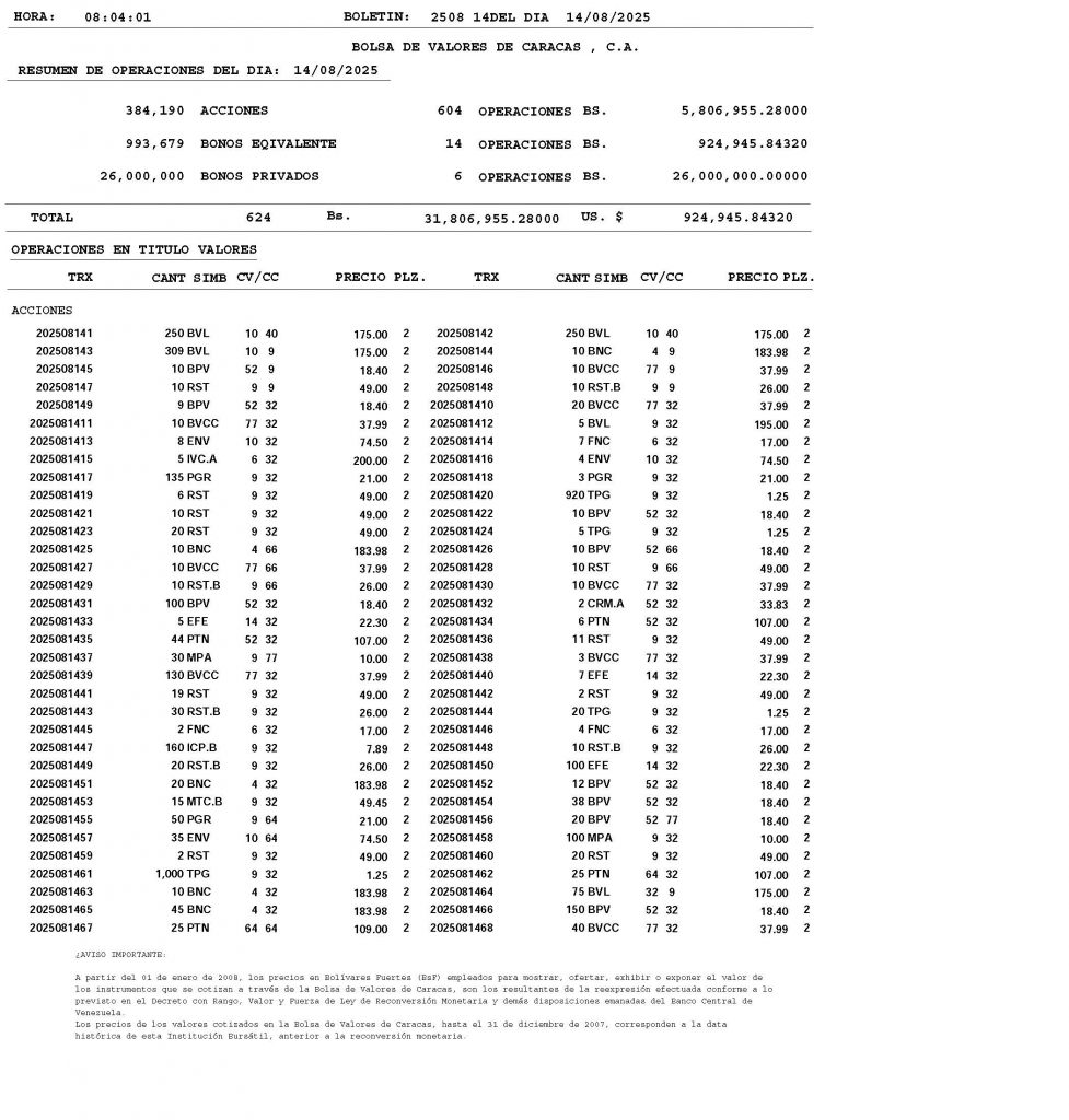 BOLETÍN DE OPERACIONES CORRESPONDIENTE AL “14/08/2025″