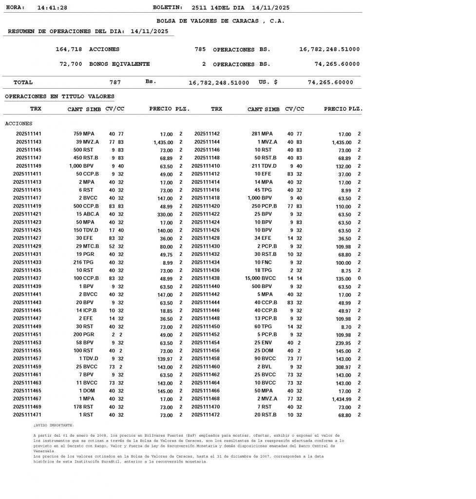 BOLETÍN DE OPERACIONES CORRESPONDIENTE AL “14/11/2025″