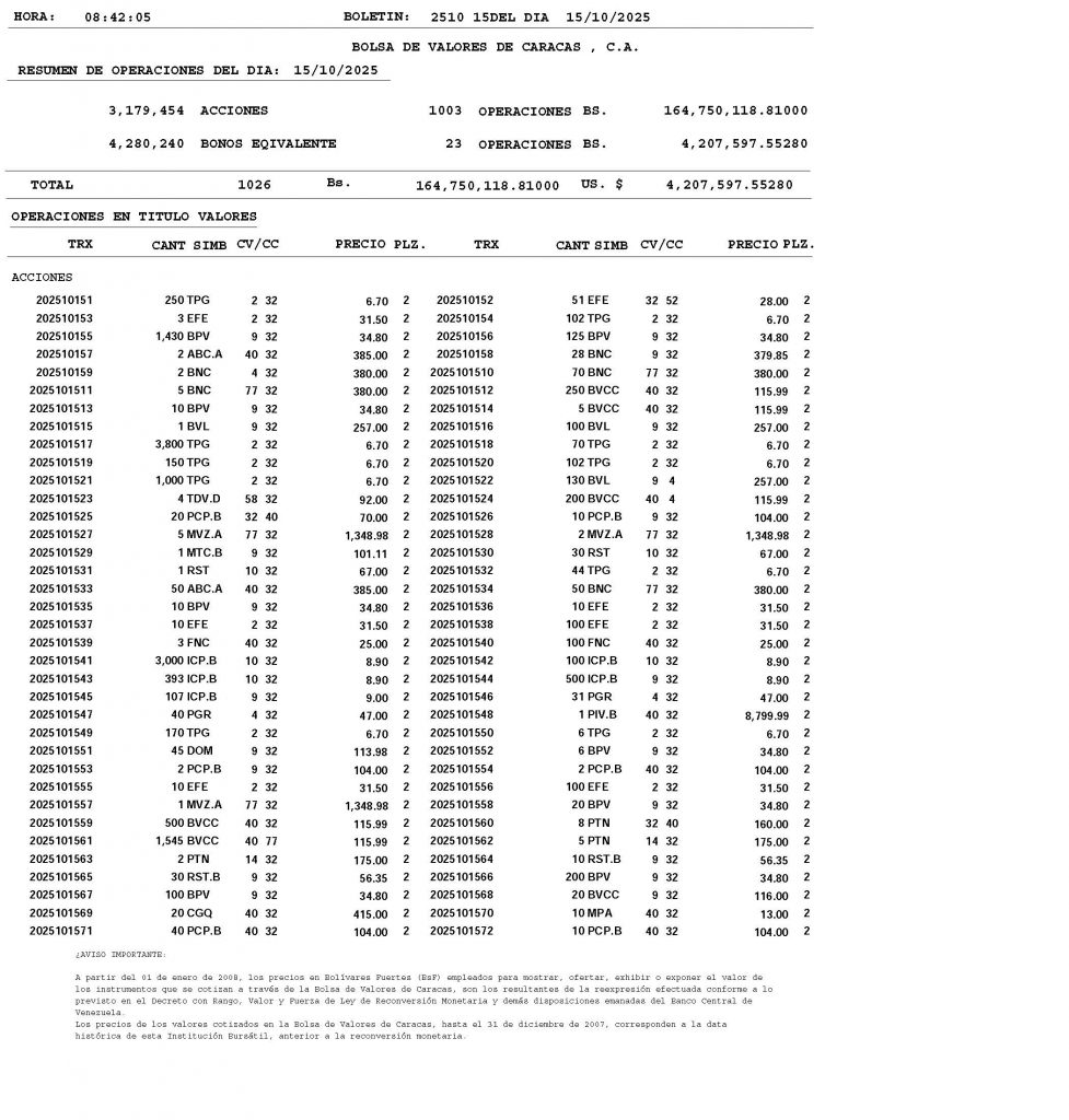 BOLETÍN DE OPERACIONES CORRESPONDIENTE AL “15/10/2025″