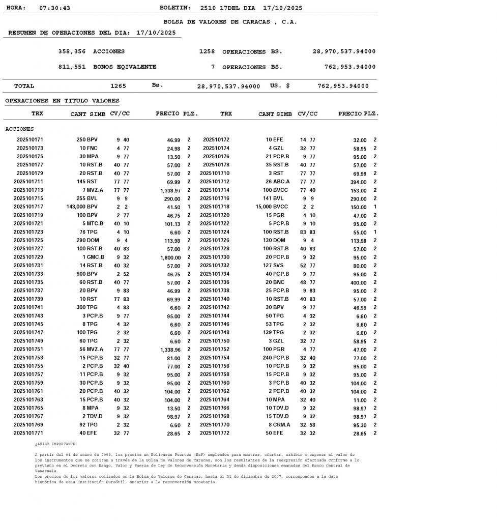 BOLETÍN DE OPERACIONES CORRESPONDIENTE AL “17/10/2025″ Y “16/10/2025″