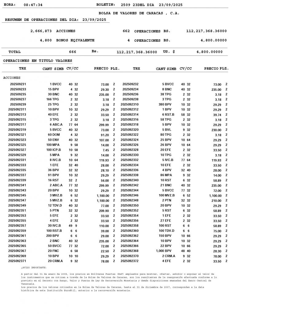BOLETÍN DE OPERACIONES CORRESPONDIENTE AL “23/09/2025″