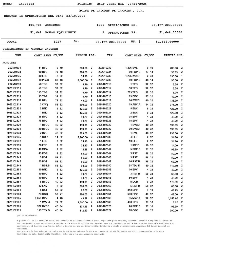 BOLETÍN DE OPERACIONES CORRESPONDIENTE AL “23/10/2025″ Y “22/10/2025″