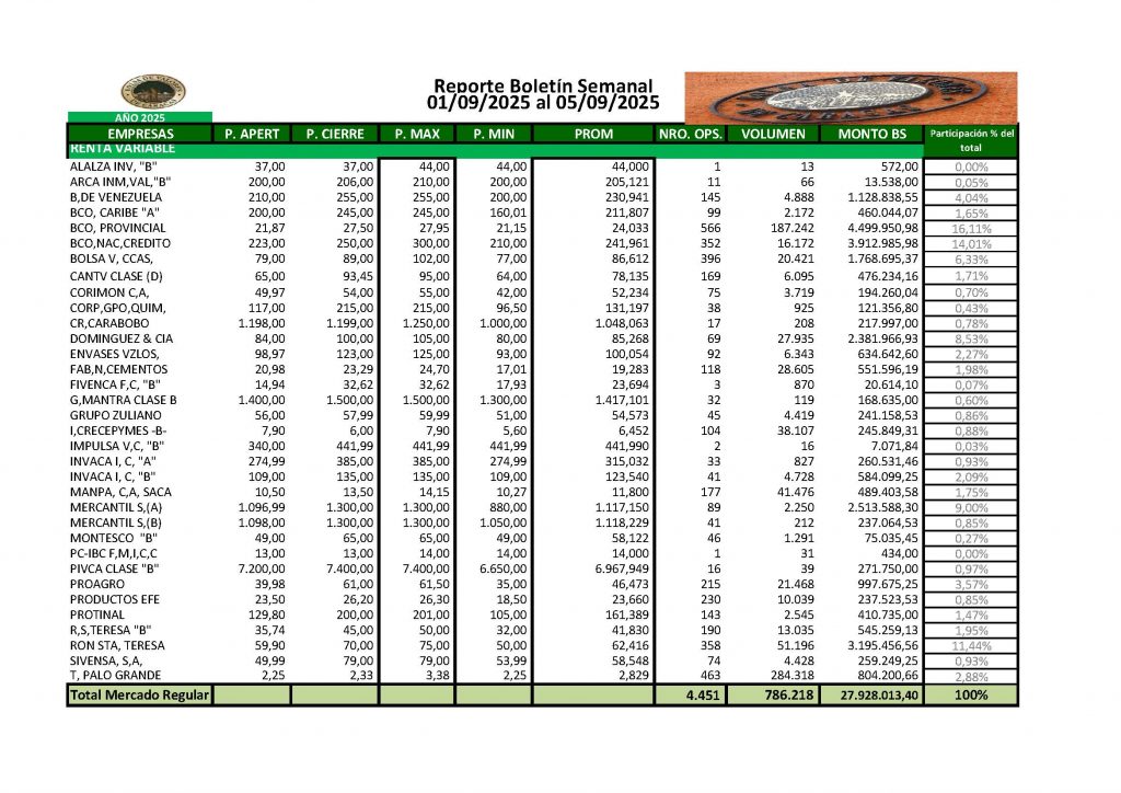 En la Bolsa de Valores de Caracas, entre el 1 y el 5 de septiembre de 2025, se negoció un total de Bs 5.027.352.453,86, un incremento de más del 289% con respecto a la semana anterior.