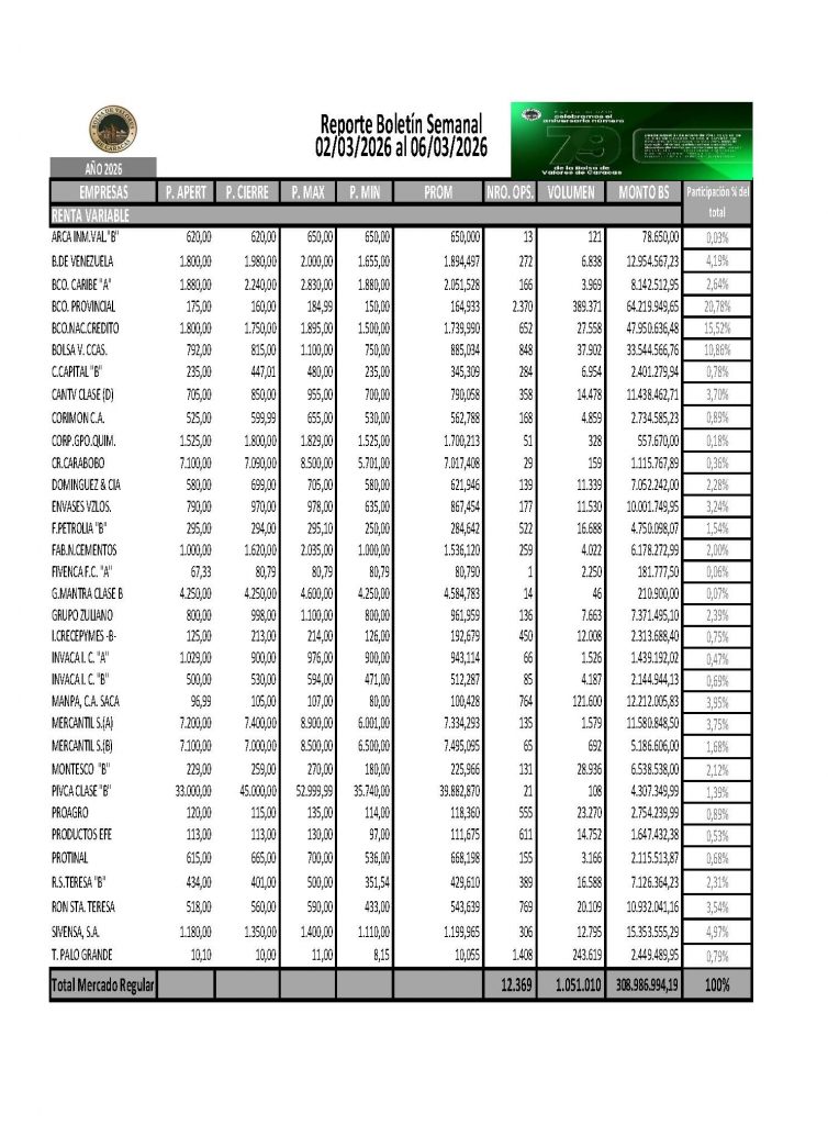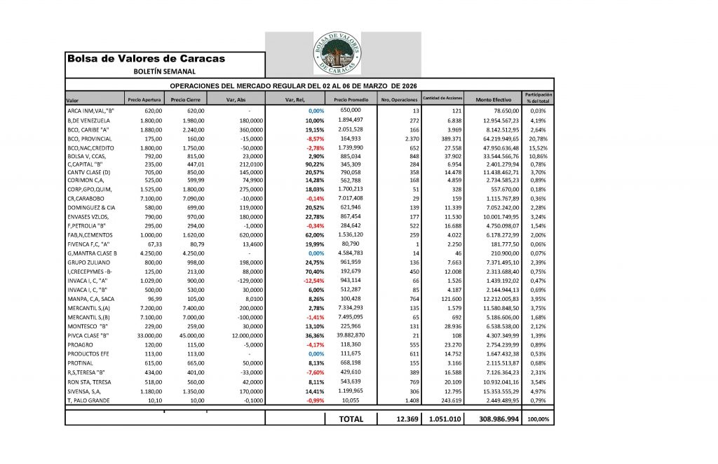 En la Bolsa de Valores de Caracas, entre el 02 y el 06 de marzo de 2026, se negoció un total de Bs 7.324.570.786,97.