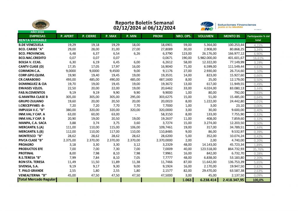 En la Bolsa de Valores de Caracas, entre el 2 y el 6 de diciembre de 2024, se negoció un total de 48 millones 568 mil 599 bolívares