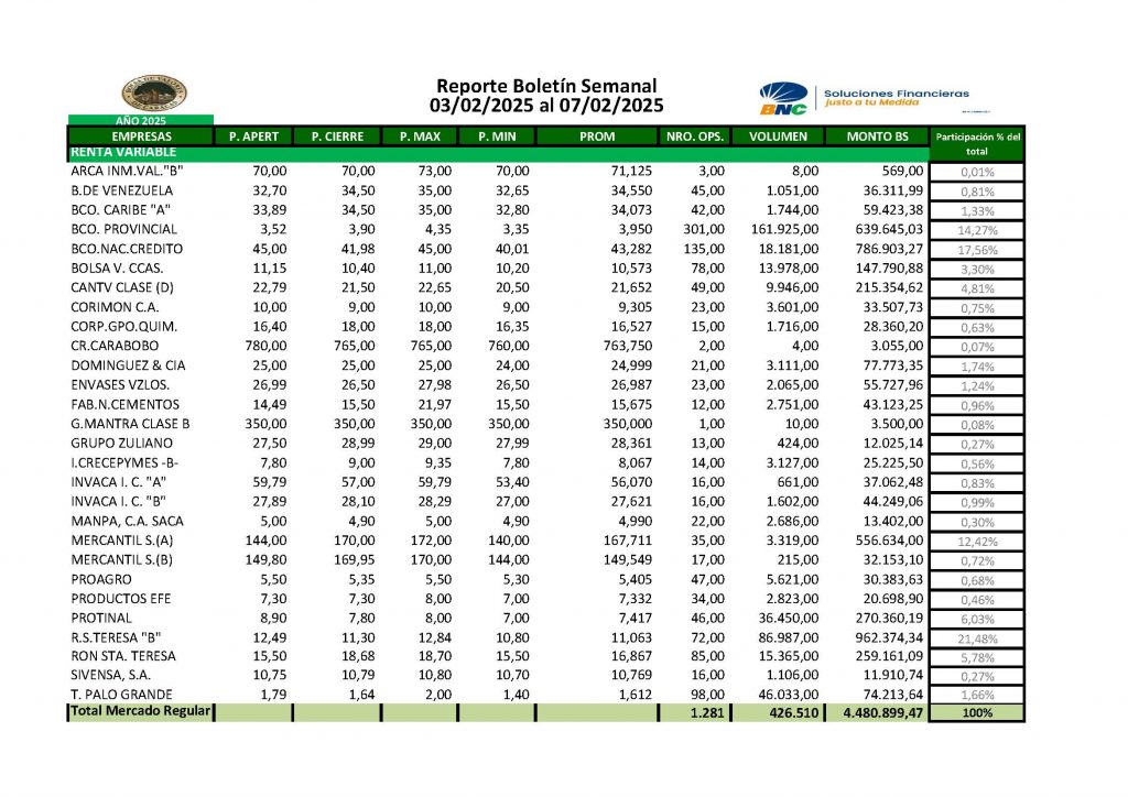 En la Bolsa de Valores de Caracas, entre el 03 y el 07 de febrero de 2025, se negoció un total de 73 millones 168 mil 105 bolívares.