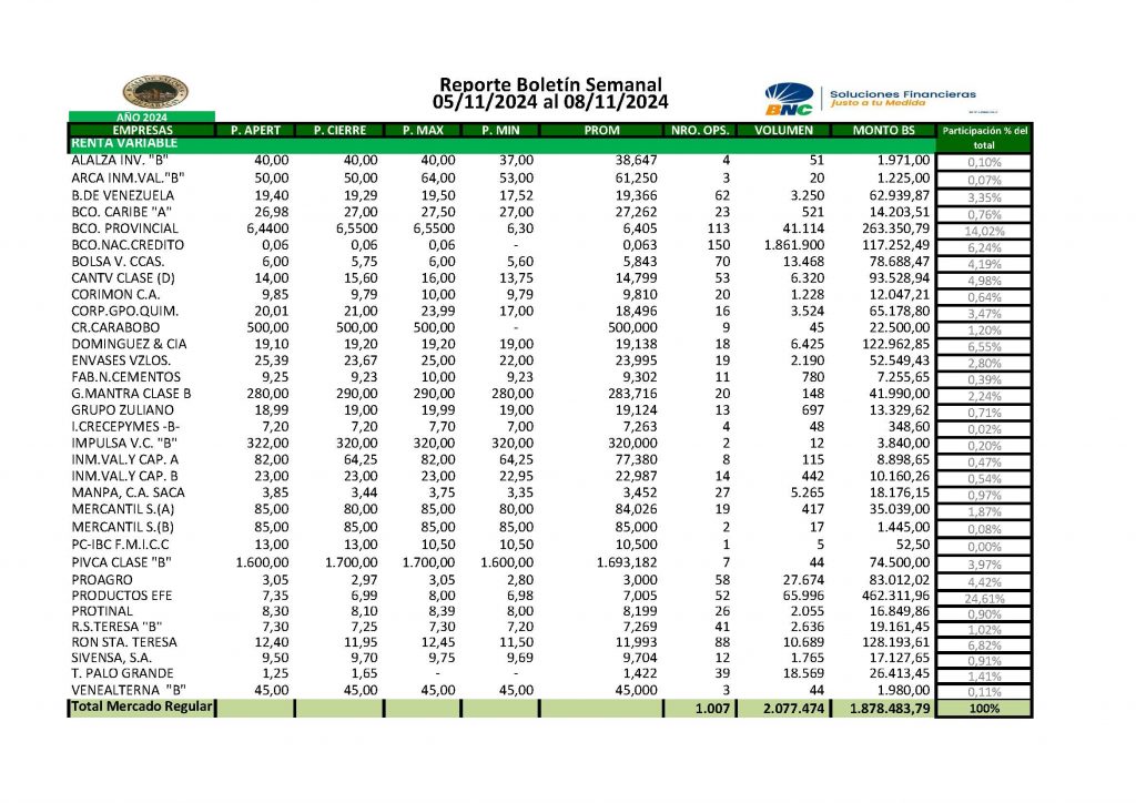 En la Bolsa de Valores de Caracas, entre el 5 y el 8 de noviembre de 2024, se negoció un total de 43 millones 842 mil 064 bolívares.