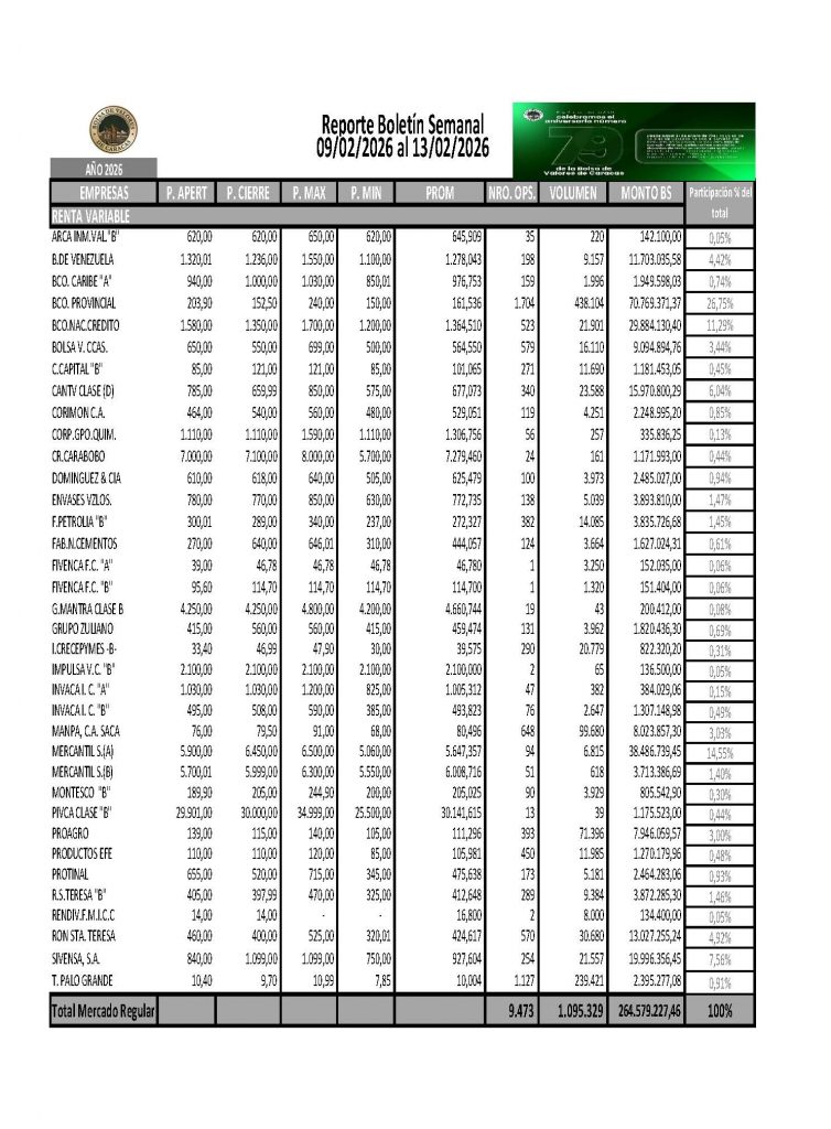 En la Bolsa de Valores de Caracas, entre el 09 y el 13 de febrero de 2026, se negoció un total de Bs 4.338.213.469,54