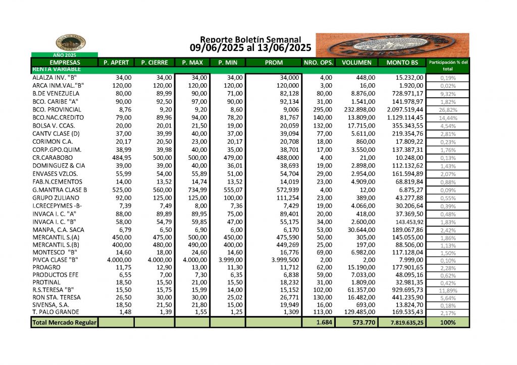 En la Bolsa de Valores de Caracas, entre el 09 y el 13 de junio de 2025, se negoció un total de Bs 456.534.756,43 con una variación positiva de +15,76% con respecto a la semana anterior.
