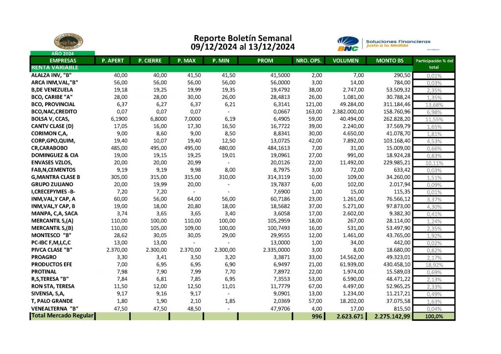 En la Bolsa de Valores de Caracas, entre el 9 y el 13 de diciembre de 2024, se negoció un total de 102 millones 836 mil 048 bolívares.