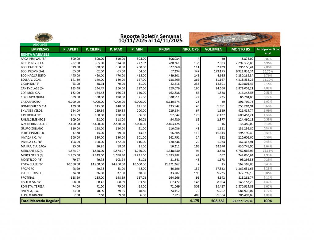 En la Bolsa de Valores de Caracas, entre el 10 y el 14 de noviembre de 2025, se negoció un total de Bs 1.641.329.963,04.