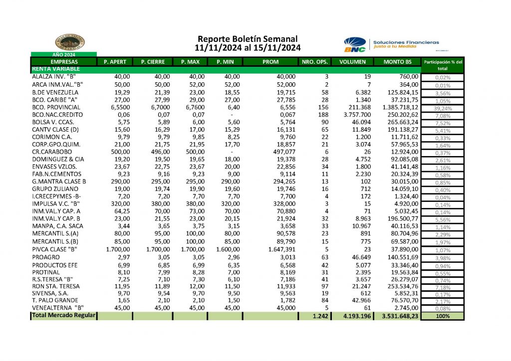 En la Bolsa de Valores de Caracas, entre el 11 y el 15 de noviembre de 2024, se negoció un total de 126 millones 499 mil 874 bolívares.