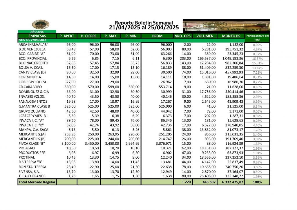 En la Bolsa de Valores de Caracas, entre el 21 y el 25 de abril de 2025, se negoció un total de Bs 281.157.140,67.