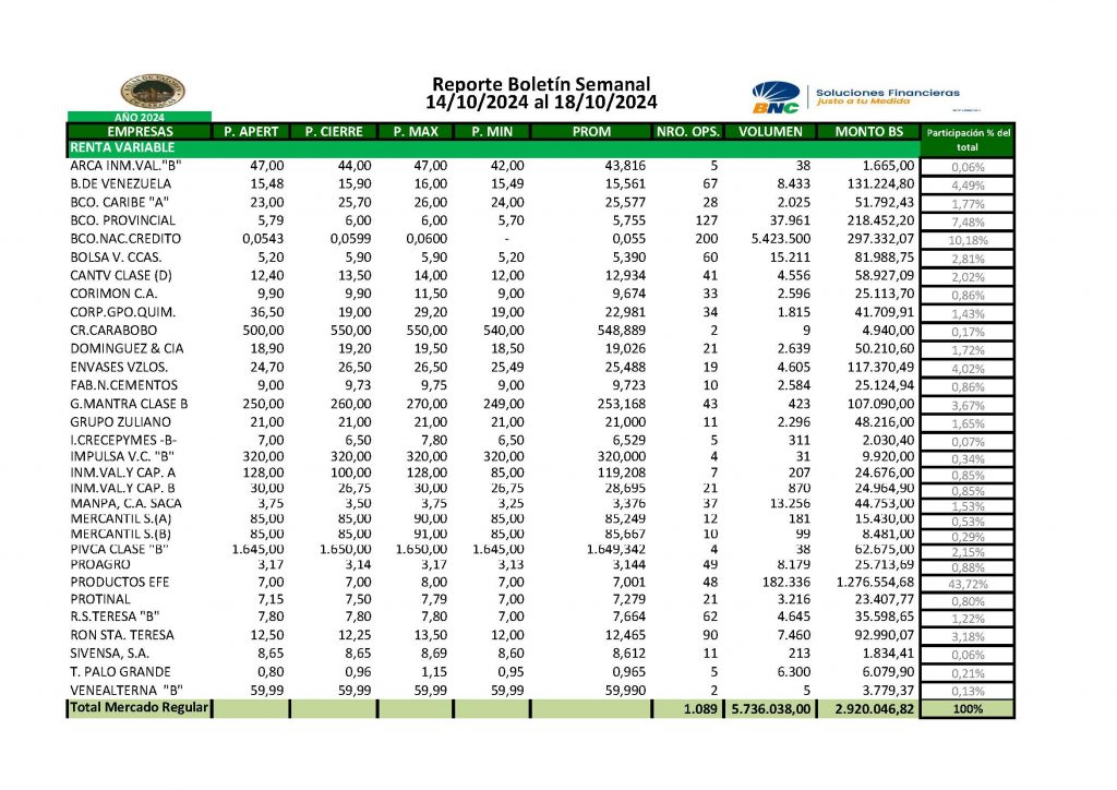 En la Bolsa de Valores de Caracas, entre el 14 al 18 de octubre de 2024, se negoció un total de 91 millones 705 mil 736 bolívares