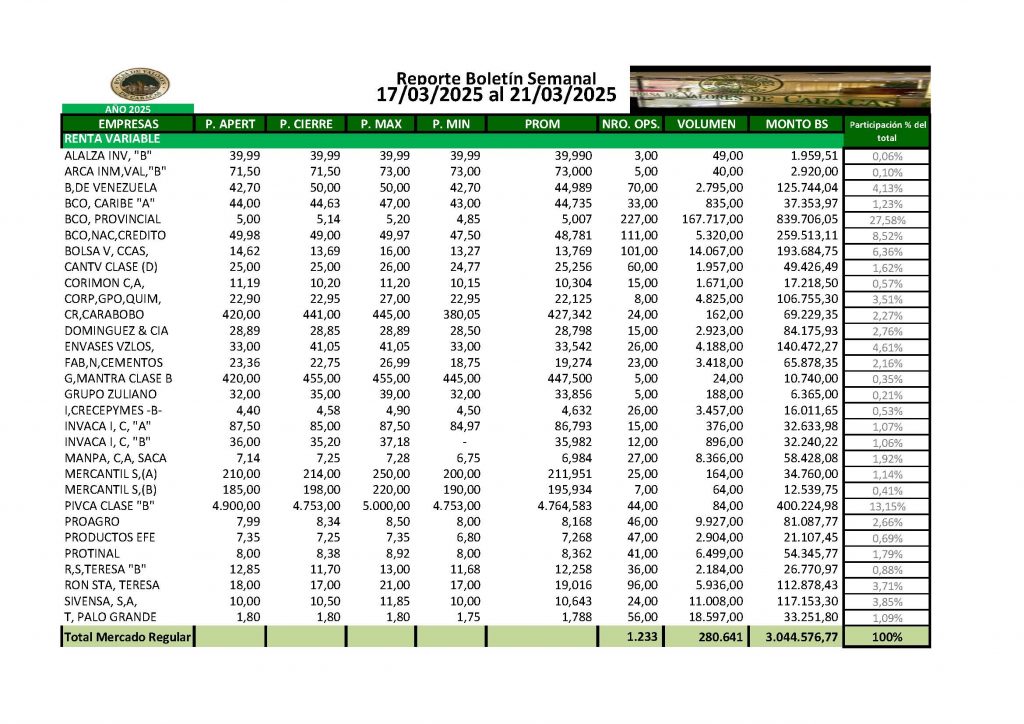 En la Bolsa de Valores de Caracas, entre el 17 y el 21 de marzo de 2025, se negoció un total de Bs 54.459.397,74.