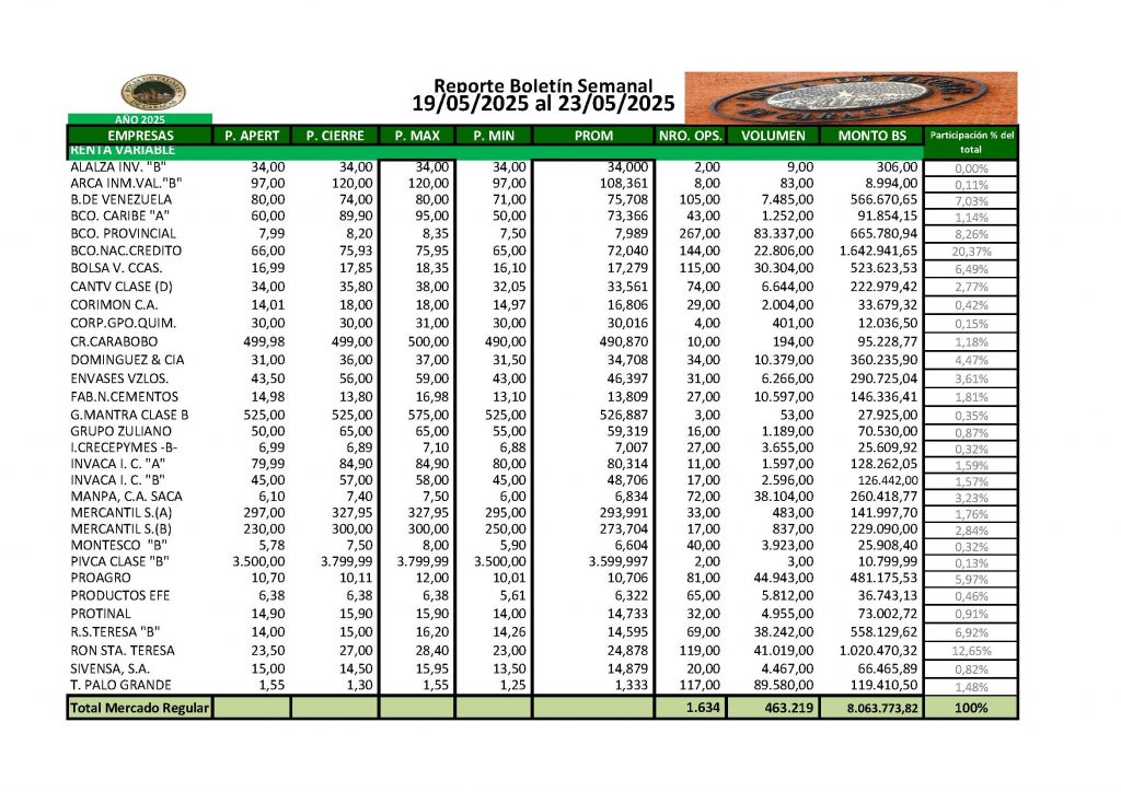 En la Bolsa de Valores de Caracas, entre el 19 y el 23 de mayo de 2025, se negoció un total de Bs 339.212.670,99.