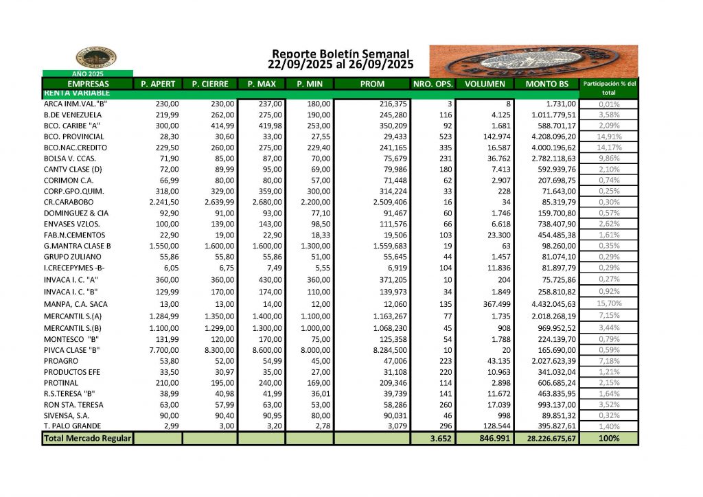 En la Bolsa de Valores de Caracas, entre el 22 y el 26 de septiembre de 2025, se negoció un total de Bs 2.281.737.517,41.