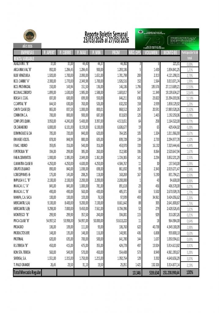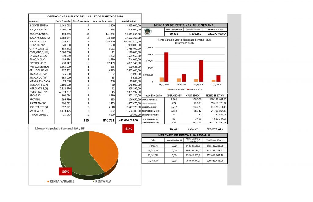 En la Bolsa de Valores de Caracas, entre el 23 y el 27 de marzo de 2026, se negoció un total de Bs 6.669.476.140,07.