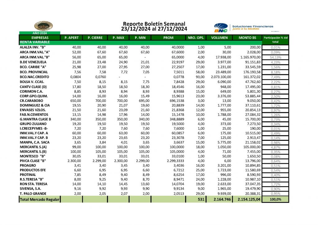 En la Bolsa de Valores de Caracas, entre el 23 y el 27 de diciembre de 2024, se negoció un total de 120 millones 042 mil 225 bolívares.