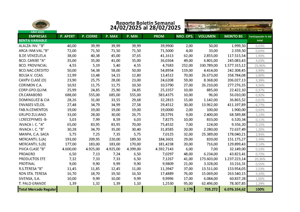 En la Bolsa de Valores de Caracas, entre el 24 y el 28 de febrero de 2025, se negoció un total de Bs 272.701.285,21.
