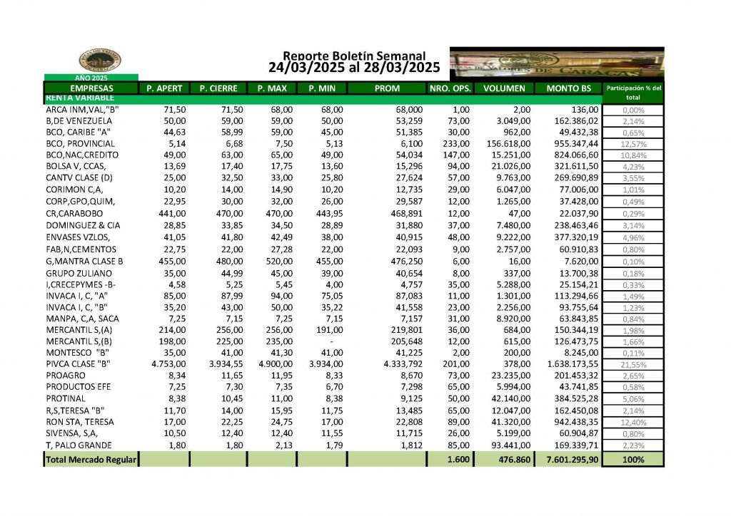 En la Bolsa de Valores de Caracas, entre el 24 y el 28 de marzo de 2025, se negoció un total de Bs 66.650.830,53.