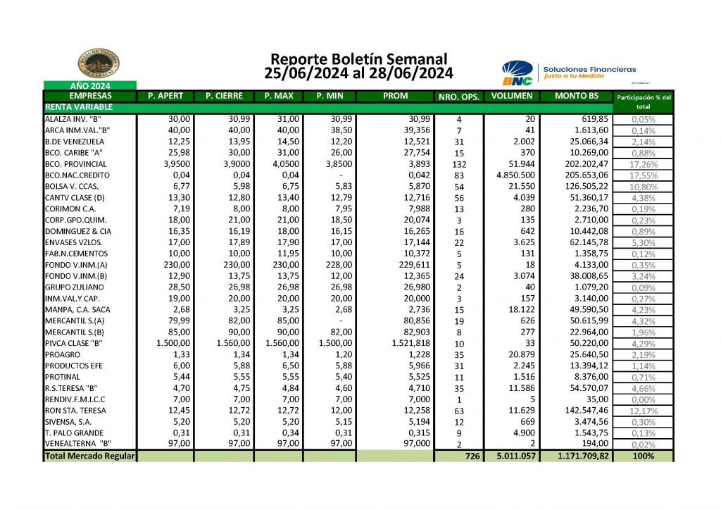 BOLETÍN EN CIFRAS SEMANAL CORRESPONDIENTE 25/06/2024 AL 28/06/2024