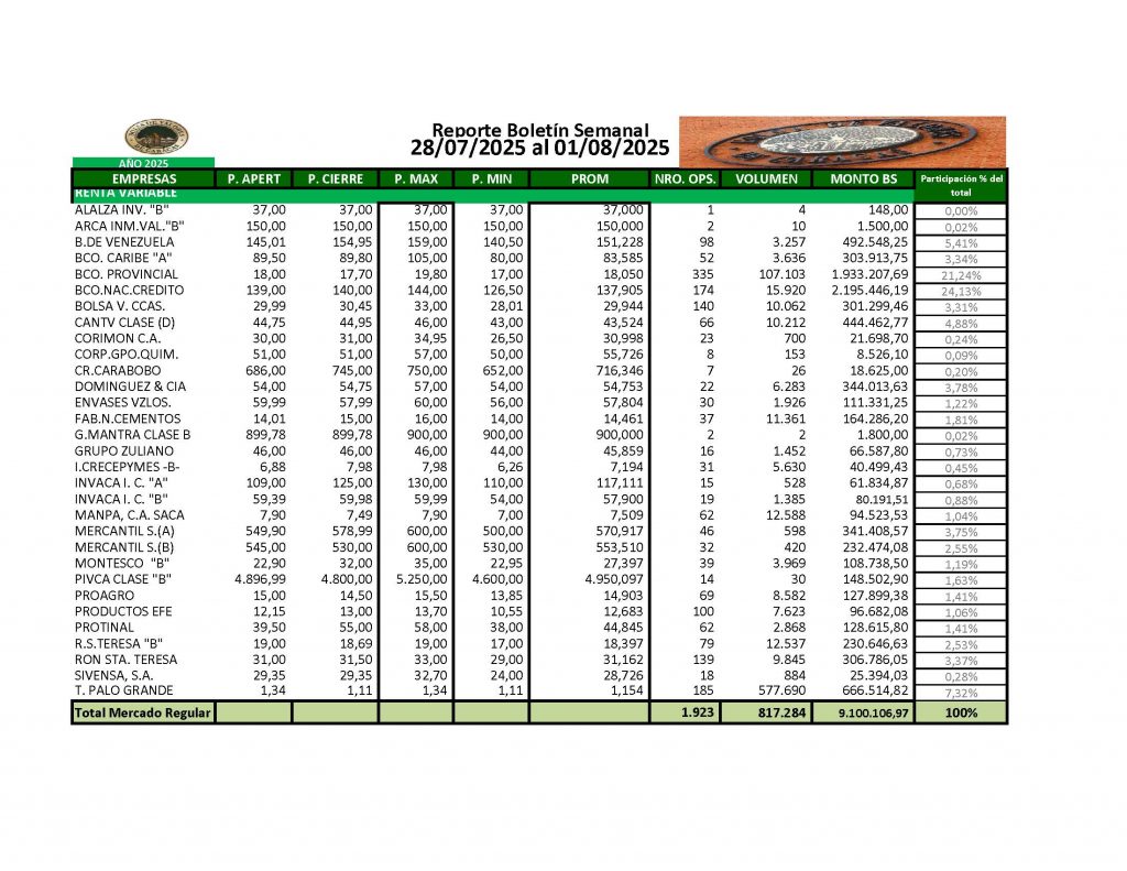 En la Bolsa de Valores de Caracas, entre el 28 de julio y el 01 de agosto de 2025, se negoció un total de Bs 770.954.962,87.