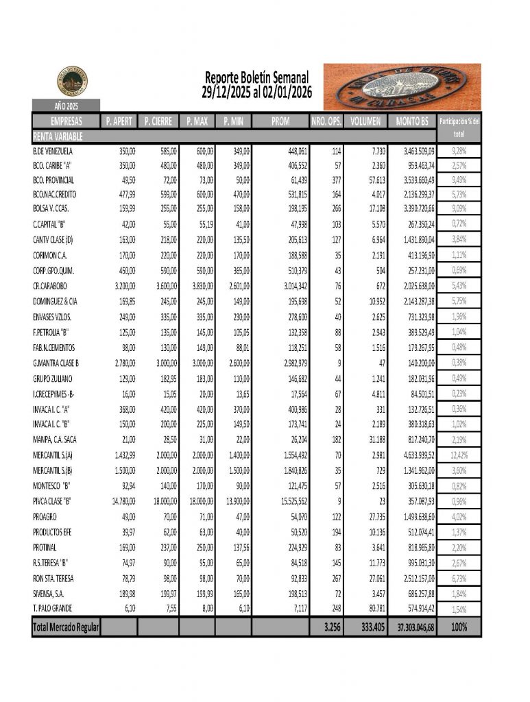 En la Bolsa de Valores de Caracas, entre el 29 de diciembre de 2025 y el 02 de enero de 2026, se negoció un total de Bs 5.317.955.221,67.