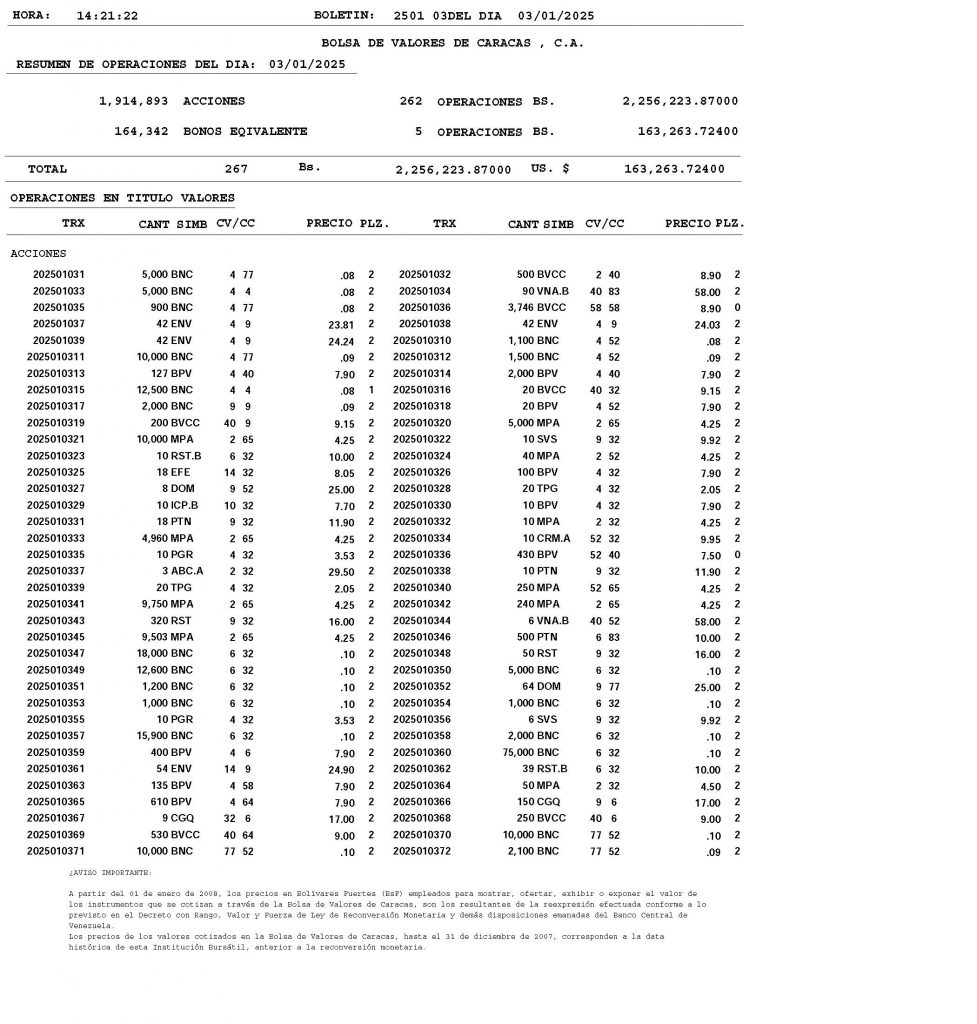 BOLSA DE VALORES DE CARACAS “BOLETÍN DE OPERACIONES 03012025”