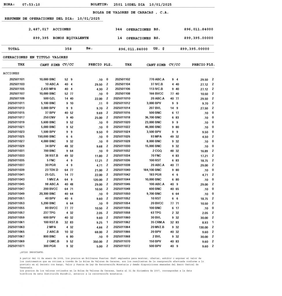 BOLSA DE VALORES DE CARACAS “BOLETÍN DE OPERACIONES 10012025”
