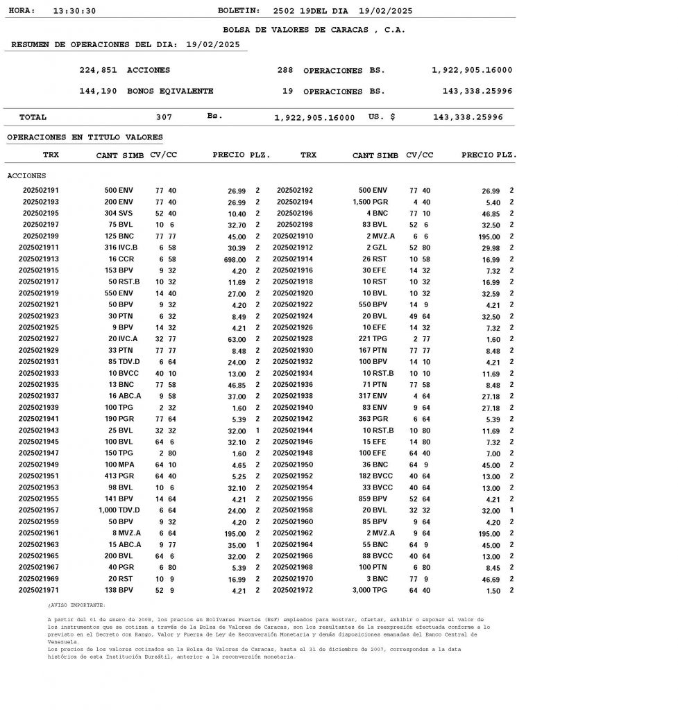 BOLSA DE VALORES DE CARACAS “BOLETÍN DE OPERACIONES 19022025″