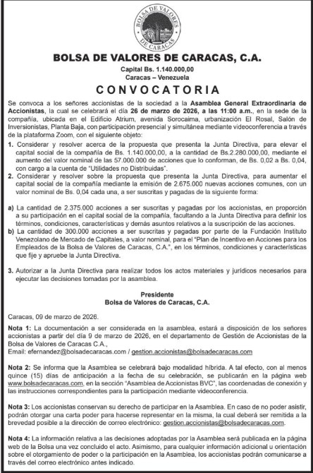 BOLSA DE VALORES DE CARACAS, C.A. ASAMBLEA GENERAL EXTRAORDINARIA DE ACCIONISTAS A CELEBRARSE EL 26 DE MARZO DE 2026