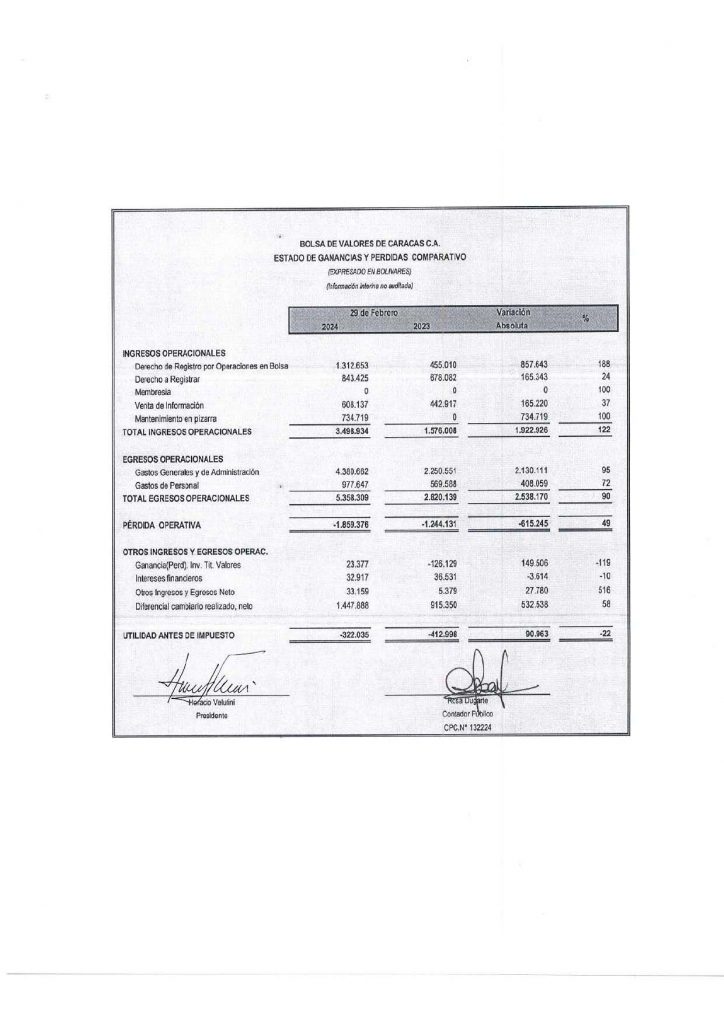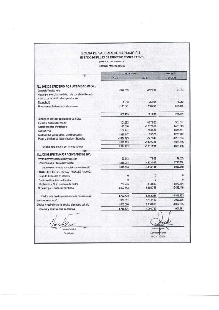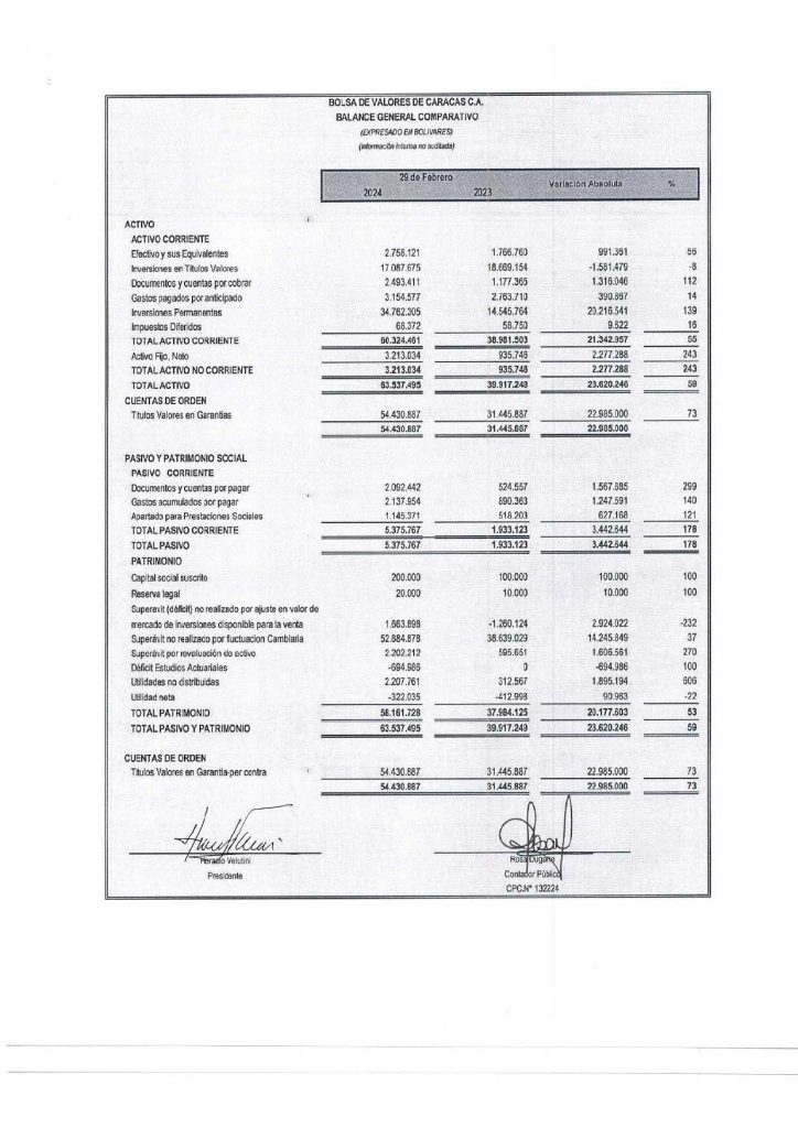 Balance General, Estado de Ganancias y Pérdidas, Estado de Movimiento de las Cuentas del Patrimonio, Estado de Flujo de Efectivo e índices financieros al 29 de Febrero de 2024 comparativo con el 28 de Febrero de 2023 de Bolsa de Valores de Caracas C.A