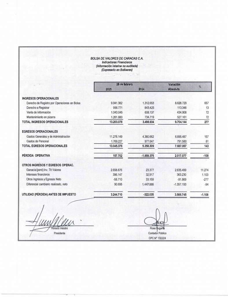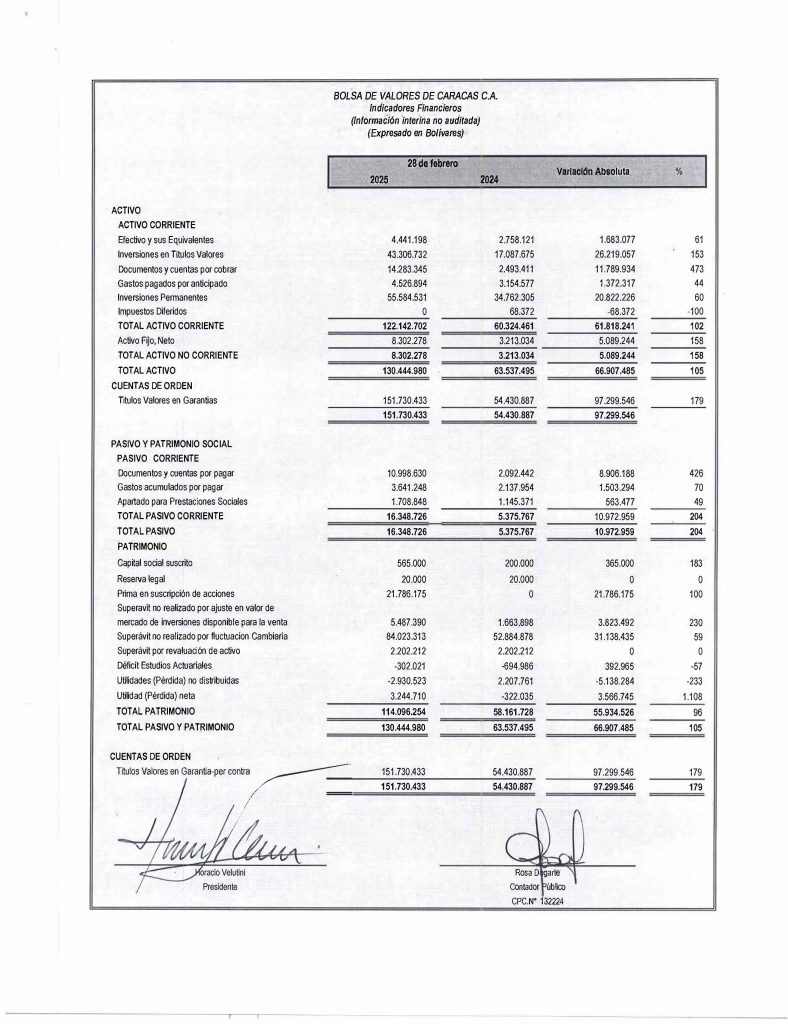 Balance General, Estado de Ganancias y Pérdidas, Estado de Movimiento de las Cuentas del Patrimonio, Estado de Flujo de Efectivo e índices financieros al 28 de Febrero de 2025 comparativo con el 28 de Febrero de 2024 de Bolsa de Valores de Caracas C.A