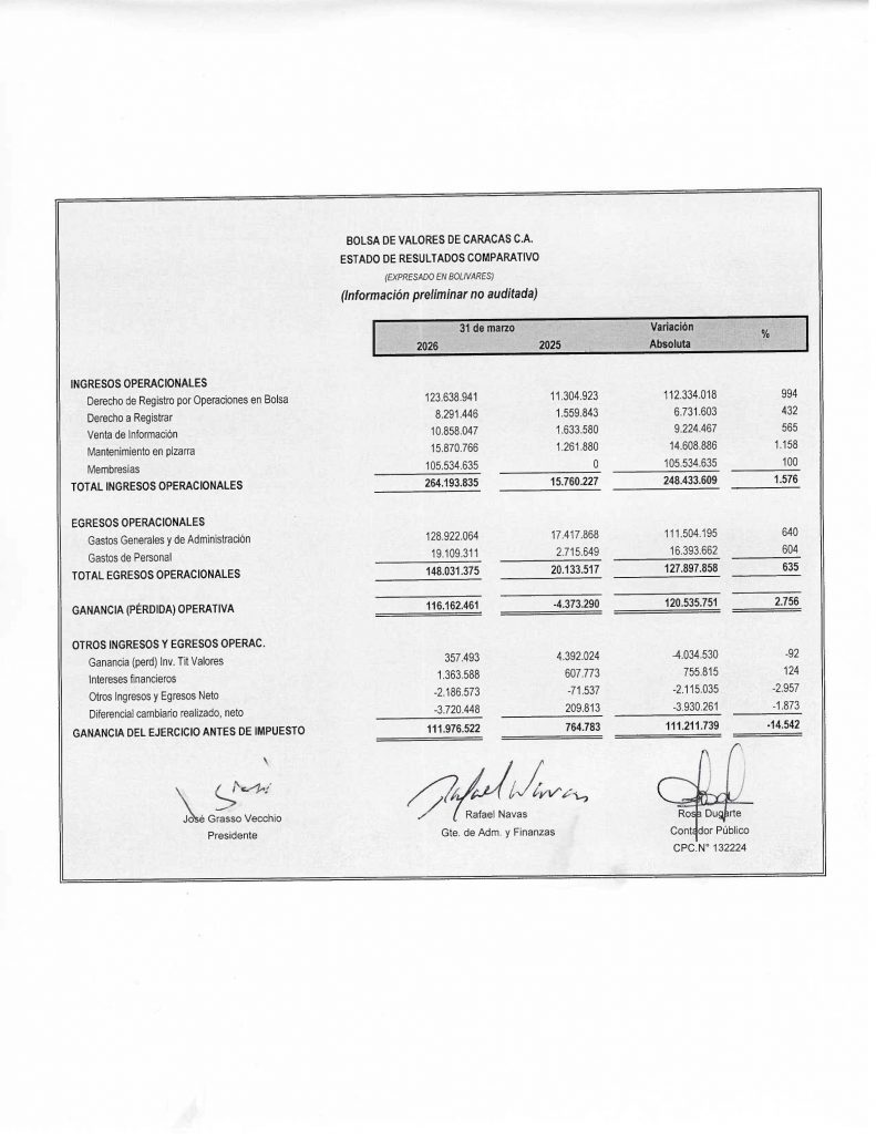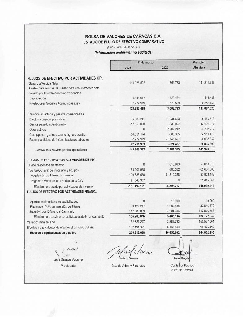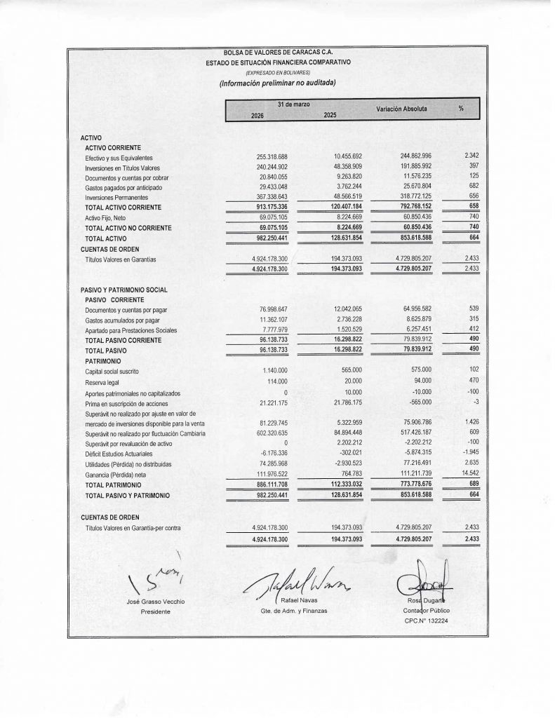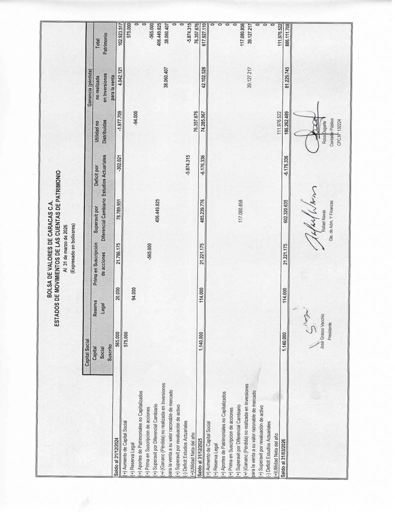 Estado de Situaci[on Financiera, Estado de Resultados, Estado de Movimiento de las Cuentas del Patrimonio, Estado de Flujo de Efectivo e índices financieros al 31 de Marzo de 2026 comparativo con el 31 de Marzo de 2025 de Bolsa de Valores de Caracas C.A