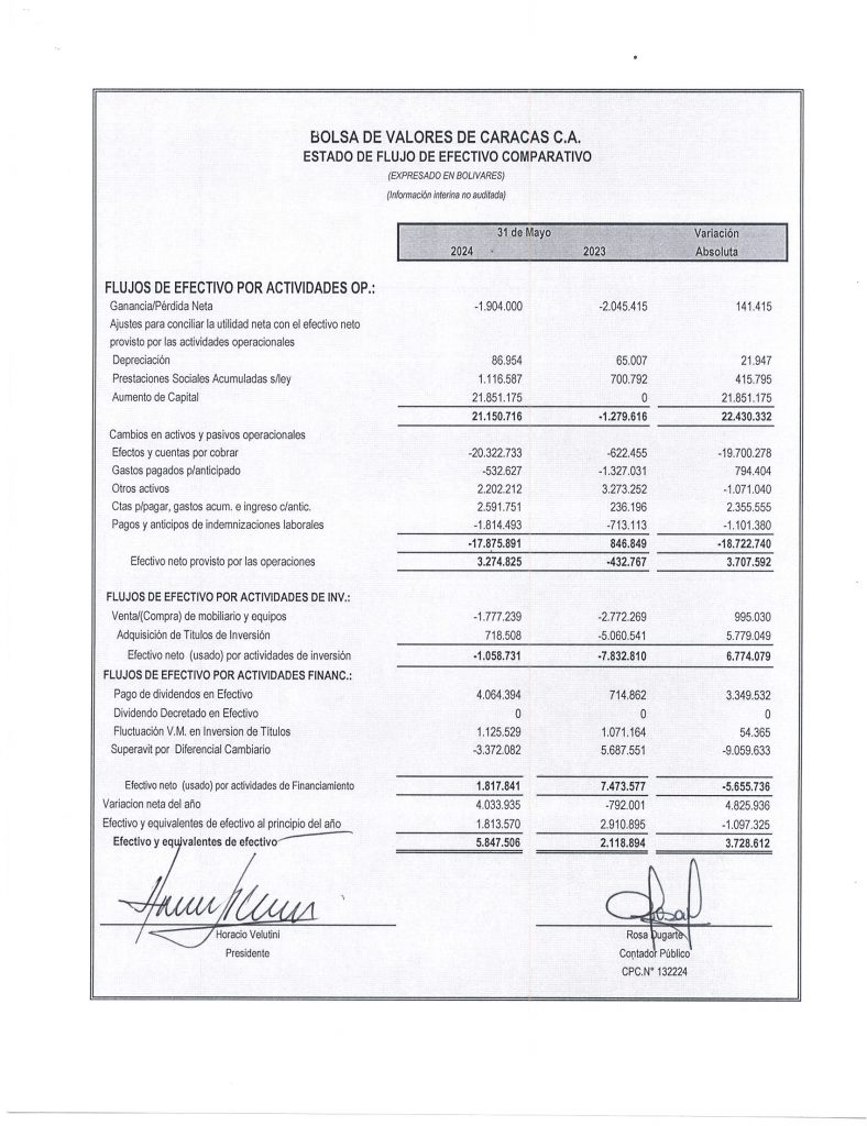 Balance General, Estado de Ganancias y Pérdidas, Estado de Movimiento de las Cuentas del Patrimonio, Estado de Flujo de Efectivo e índices financieros al 31 de Mayo de 2024 comparativo con el 31 de Mayo de 2023 de Bolsa de Valores de Caracas C.A