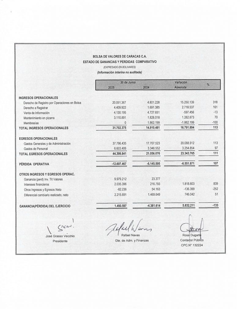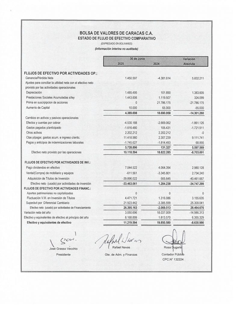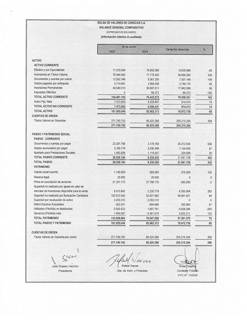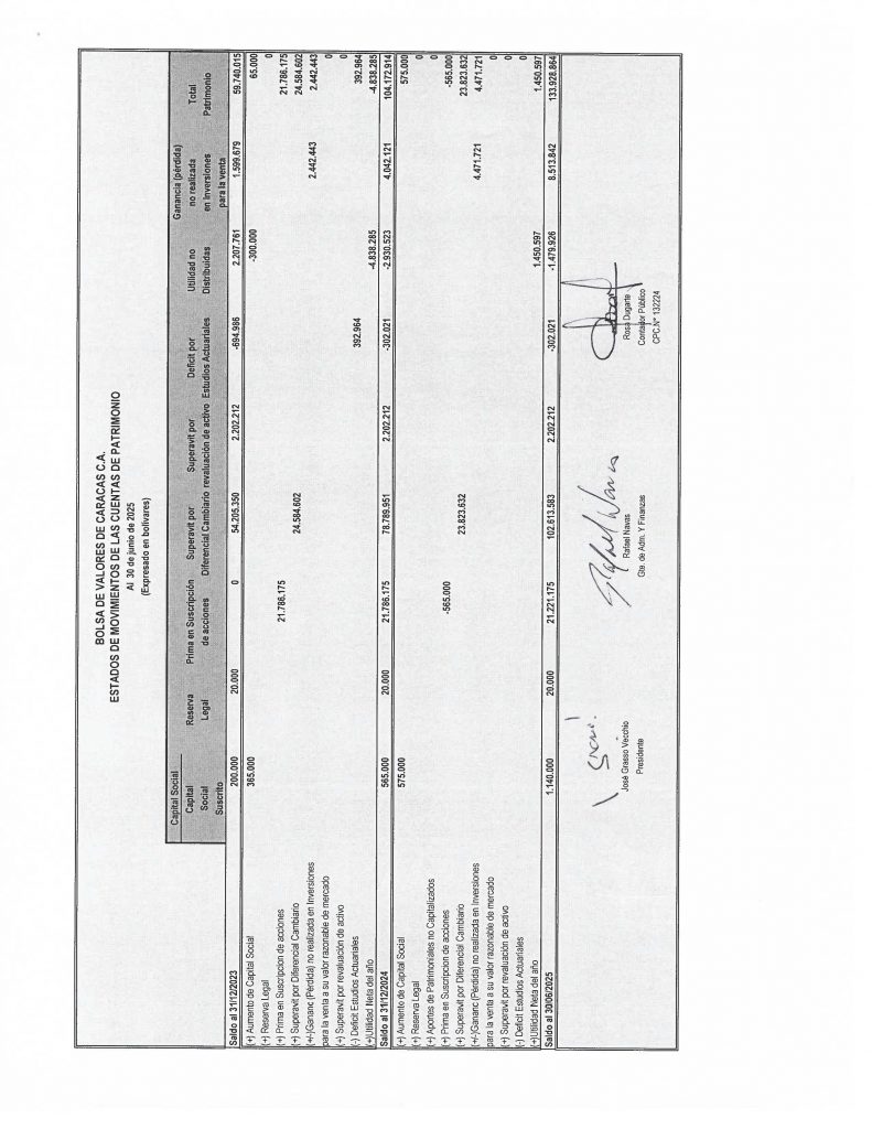 Balance General, Estado de Ganancias y Pérdidas, Estado de Movimiento de las Cuentas del Patrimonio, Estado de Flujo de Efectivo e índices financieros al 30 de Junio de 2025 comparativo con el 30 de junio de 2024 del emisor Bolsa de Valores de Caracas C.A