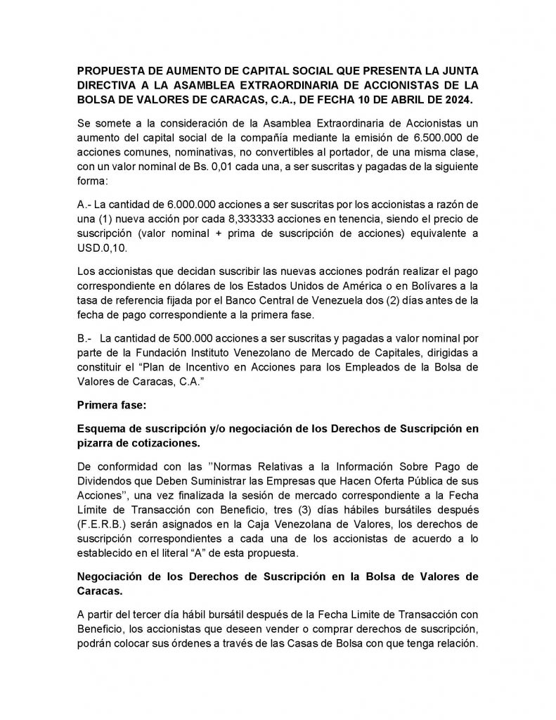 PROPUESTA DE AUMENTO DE CAPITAL SOCIAL QUE PRESENTA LA JUNTA DIRECTIVA A LA ASAMBLEA EXTRAORDINARIA DE ACCIONISTAS DE LA BOLSA DE VALORES DE CARACAS, C.A., DE FECHA 10 DE ABRIL DE 2024.
