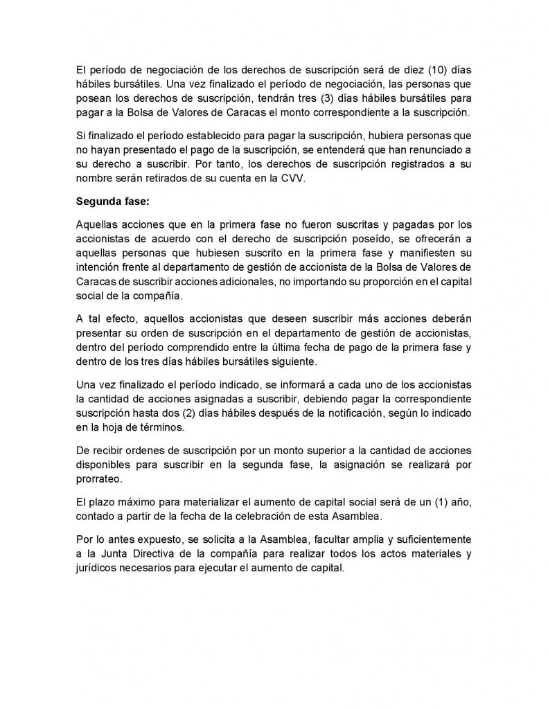 Aquellas acciones que en la primera fase no fueron suscritas y pagadas por los accionistas de acuerdo con el derecho de suscripción poseído, se ofrecerán a aquellas personas que hubiesen suscrito en la primera fase y manifiesten su intención frente al departamento de gestión de accionista de la Bolsa de Valores de Caracas de suscribir acciones adicionales, no importando su proporción en el capital social de la compañía.
