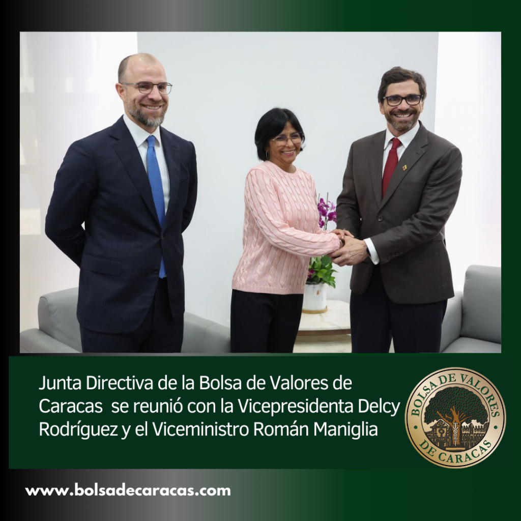 La Junta Directiva de la Bolsa de Valores de Caracas se reunió, este jueves, con la Vicepresidenta Ejecutiva de la República, Delcy Rodríguez, y el Viceministro de Finanzas, Román Maniglia, en la sede del Despacho de Finanzas.