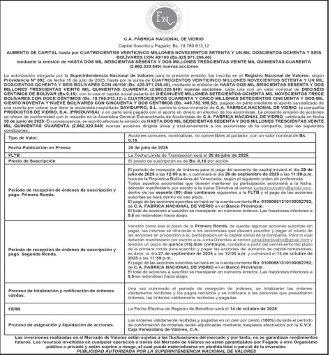 La autorización otorgada por la Superintendencia Nacional de Valores para la presente emisión fue inscrita en el Registro Nacional de Valores, según Providencia Nº 092, de fecha 16 de julio de 2025, hasta por la suma de CUATROCIENTOS VEINTICINCO MILLONES NOVECIENTOS SETENTA Y UN MIL DOSCIENTOS OCHENTA Y SEIS BOLÍVARES CON 40/100 (Bs. 425.971.286,40), mediante la emisión de HASTA DOS MIL SEISCIENTAS SESENTA Y DOS MILLONES TRESCIENTAS VEINTE MIL QUINIENTAS CUARENTA (2.662.320.540) nuevas acciones, cada una con un valor nominal de DIECISÉIS CÉNTIMOS DE BOLÍVAR (Bs.0,16), con lo cual el capital social pasaría de DIECINUEVE MILLONES SETECIENTOS OCHENTA MIL NOVECIENTOS TRECE BOLÍVARES CON DOCE CÉNTIMOS (Bs. 19.780.913,12) a CUATROCIENTOS CUARENTA Y CINCO MILLONES SETECIENTOS CINCUENTA Y DOS MIL CIENTO NOVENTA Y NUEVE BOLÍVARES CON CINCUENTA Y DOS CÉNTIMOS (Bs. 445.752.199,52), pagado en parte mediante el aporte ya realizado de una cuenta por cobrar que tiene la accionista mayoritaria SAVIDUPRO, S.L. contra la única inversión de C.A. FABRICA NACIONAL DE VIDRIO, la compañía PRODUCTOS DE VIDRIO, S.A. (PRODUVISA), y en parte será pagado con el aporte en dinero en efectivo de los accionistas. La presente emisión de acciones se ofrece de conformidad con lo resuelto en la Asamblea General Extraordinaria de Accionistas de C.A. FABRICA NACIONAL DE VIDRIO,celebrada en fecha 30 de junio de 2025. En consecuencia, se acordó efectuar la emisión de HASTA DOS MIL SEISCIENTAS SESENTA Y DOS MILLONES TRESCIENTAS VEINTE MIL QUINIENTAS CUARENTA (2.662.320.540) nuevas acciones dirigida única y exclusivamente a los accionistas de la compañía, bajo las siguientes condiciones: