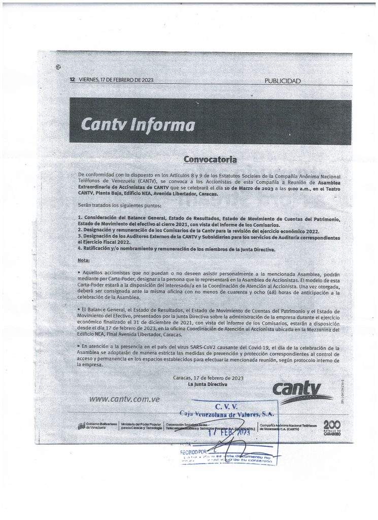 C.A. NACIONAL TELÉFONOS DE VENEZUELA (CANTV)., ASAMBLEA DE ACCIONISTAS NUEVA FECHA A CELEBRARSE 24 DE MARZO DE 2023