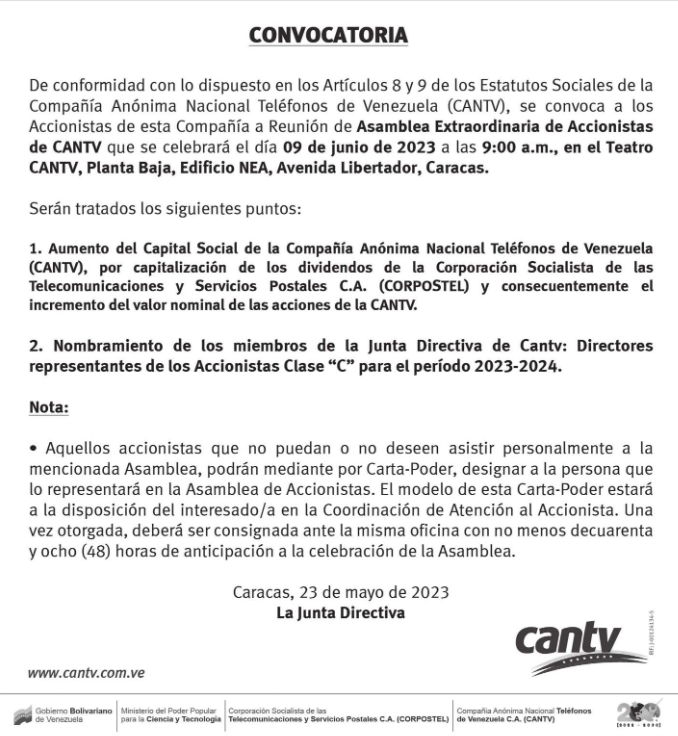 De conformidad con lo dispuesto en los Artículos 8 y 9 de los Estatutos Sociales de la Compañía Anónima Nacional Teléfonos de Venezuela (CANTV), se convoca a los Accionistas de esta Compañía a Reunión de Asamblea Extraordinaria de Accionistas de CANTV que se celebrará el día 09 de junio de 2023 a las 9:00 a.m., en el Teatro CANTV, Planta Baja, Edificio NEA, Avenida Libertador, Caracas.
