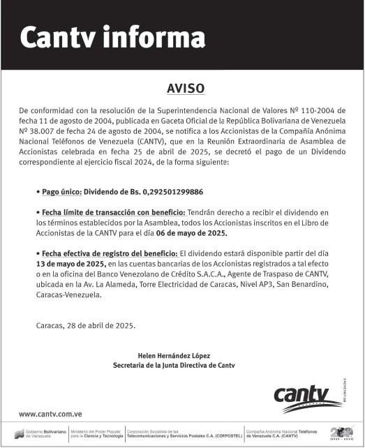De conformidad con la resolución de la Superintendencia Nacional de Valores Resolución Nro. 110-2004 de fecha 11 de agosto de 2004, publicada en Gaceta Oficial de la República Bolivariana de Venezuela Nro. 38.007 de fecha 24 de agosto de 2004, se notifica a los Accionistas de la Compañía Anónima Nacional Teléfonos de Venezuela (CANTV), que en la Asamblea Extraordinaria de Accionistas de CANTV, celebrada en fecha 25 de abril de 2025, se decretó el pago de un Dividendo, correspondiente al ejercicio fiscal 2024, de la forma siguiente:
